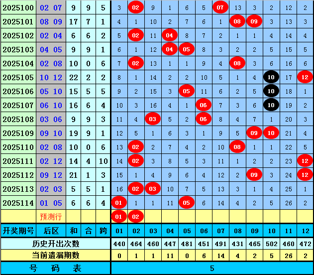 后区分析【一区01-04,二区05-08,三区09-12】:上期后区奖号为01和05,分别落在第一、二区,近50期后区三区比为39:27:34,近10期三区比为6:5:9,本期重防第一区号码大热,精选两码01+02。