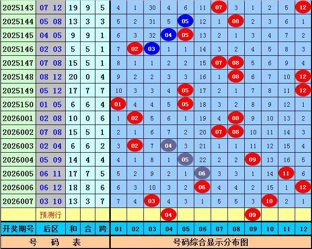 后区上期开出奖号03和10,该组合历史上出现了58次,其下期奖号频次分别为:号码04、09出现13次,10出现12次,01、08出现11次,06、07出现10次,03、05、11出现8次,02出现7次,12出现3次,本期后区参考号码02、04、09、12,精选两码04和09。