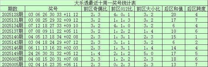 后区分析:上期后区奖号为03+10,开出一大一小组合,上周一后区奖号开出06+11,最近十周一后区奖号大小比为14:6,大号明显较热,本周一看好大号出现,参考一大一小组合,关注两码04、10。