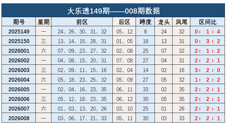 大乐透第2026008期出奖号统计:前区03、06、17、21、33,后区05、11。前区跨度30,龙头03,凤尾33,区间比比2:2:1。