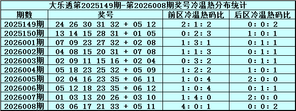 体彩大乐透第26008期奖号为:03 06 17 21 33+05 11,前区奖号奇偶比为4:1,012路比为4:0:1,大小比为2:3,遗漏总值为65,后区号码遗漏总值为5。