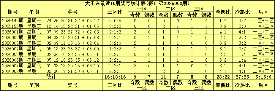 综上所述,大乐透第2026009期前区三区比看好2:2:1。