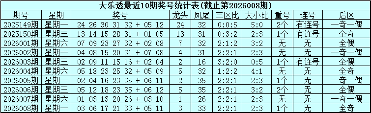 大乐透第2026008期奖号为:03、06、17、21、33+05、11。其中前区三区比为2:2:1,大小比为2:3,包含1个重号,没有出现连号,后区为全奇号码。