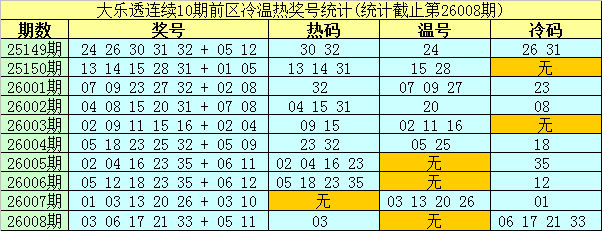 开奖回顾:体彩大乐透第26008期开出奖号:03 06 17 21 33 + 05 11,前区号码和值为80,大小比为2:3,跨度为30,奇偶比为4:1。后区为热码+热码。