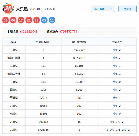 大乐透第2026008期开出奖号为:03、06、17、21、33+05、11。其中前区奇偶比为4:1,三区比为2:2:1,大小比为2:3,后区开出全奇组合。