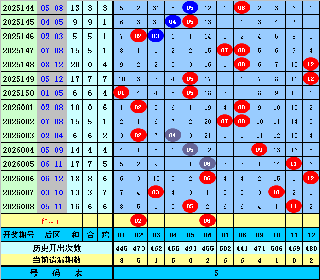 后区分析(定义:01-04为一区,05-08为二区,09-12为三区):上期后区开出奖号05和11,分别出现在第二区和第三区和区,最近10期后区三个区间落号个数比为5:9:6,本期后区注意第一区和第二区号码出现,关注两码02、06。