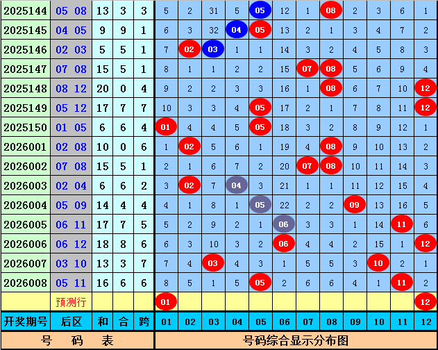 后区分析:上期该位开出奖号05和11,和值为16,跨度为6,后区前4次开出和值16和跨度6时,其下期奖号分别为:01+04、03+12、03+10、07+11,号码奇偶比为5:3,大小比为4:4,012路比为3:4:1,本期后区号码参考01、04、05、08、12,精选两码01、12。
