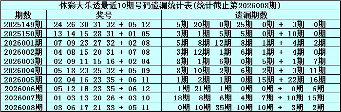 体彩大乐透第2026008期奖号为:03 06 17 21 33 + 05 11,前区号码奇偶比为4:1,大小比为2:3,和值为80,012路比为4:0:1,后区号码奇偶比为2:0,大小比为1:1。