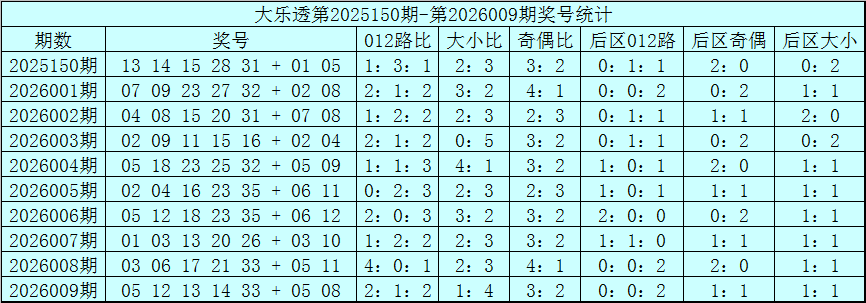 体彩大乐透第26009期奖号为:05 12 13 14 33+05 08,前区奖号012路比为2:1:2,奇偶比为3:2,大小比为1:4,后区为全2路号码。