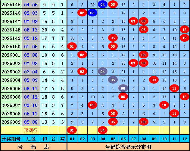 后区分析:上期后区为一奇一偶号码05+08,最近10期后区号码奇偶比为10:10,最近50期后区奇偶比为50:50,本期后区参考一奇一偶组合,关注两码01、04。