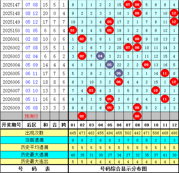 后区判断:上期后区奖号为05和08,开出热码+温码组合。最近十期后区开出9个热码、5个温码和6个冷码,本期预计奖号关注温码+热码组合,参考两码02、08。