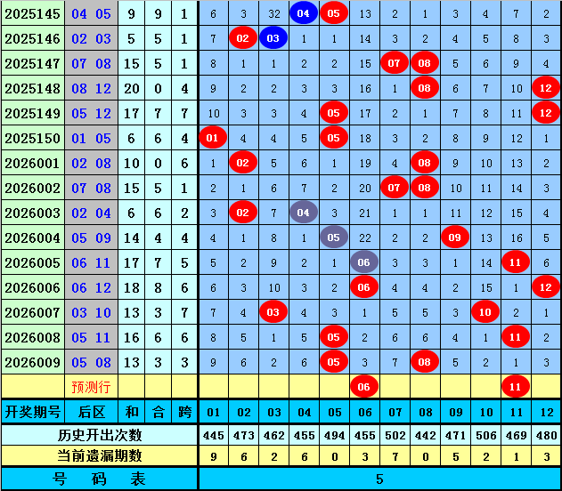 后区第二位推荐:在连续5期开奖中分别出号:11、12、10、11、08,均值为10.4,其中奇数奖号表现较冷,本期适当关注回补,参考奇数号码11。