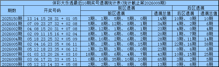 凡哥体彩大乐透第2026010期前区五区遗漏分析:(定义:遗漏0-3期号码为热码,遗漏4-9期号码为温码,遗漏10期及10期以上号码为冷码)