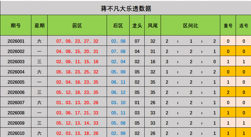 大乐透上期数据分析:前区02,03,13,18,26,后区02,09,前区龙头02,凤尾26,区间比2:2:1,开出重号13。开出连号02,03。
