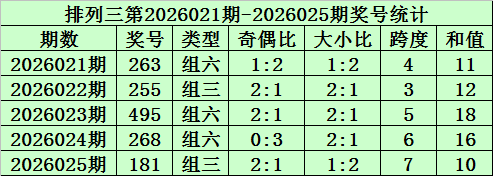 上期回顾:排列三第2026025期开奖号码为181。奖号类型为组三,奇偶比为2:1,大小比为1:2,跨度为7,和值为10。