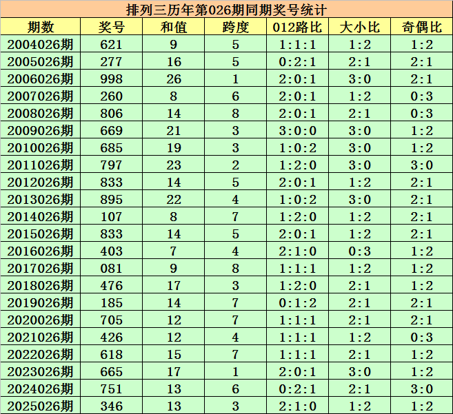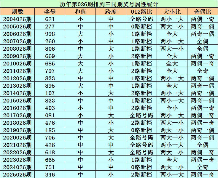 历史上第2026026期排列三已开出22期奖号了,历年同期奖号分别为:621、277、998、260、806、669、685、797、833、895、107、833、403、081、476、185、705、426、618、665、751、346,详细统计见下表: