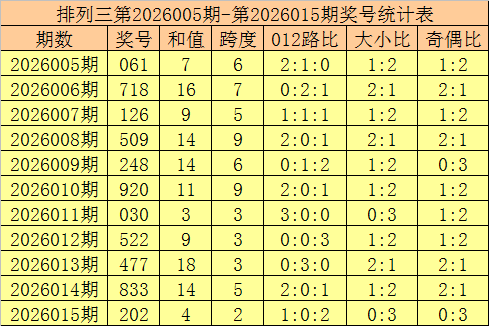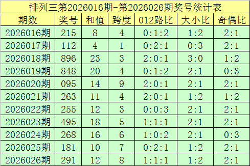 开奖回顾:排列三第2026026期奖号开出:291,组选类型:组六,大小比为1:2,奇偶比为2:1,和值为12,跨度为8。