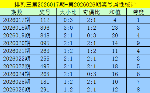 上期回顾:排列三第2026026期出现奖号291。开出组六,奇偶比2:1,012路比1:1:1,大小比1:2,和值12,跨度8。