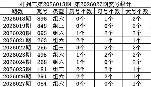 上期回顾:排列三第2026027期开奖:084,质合比为0:3,奇偶比为1:2,大小比为0:3。