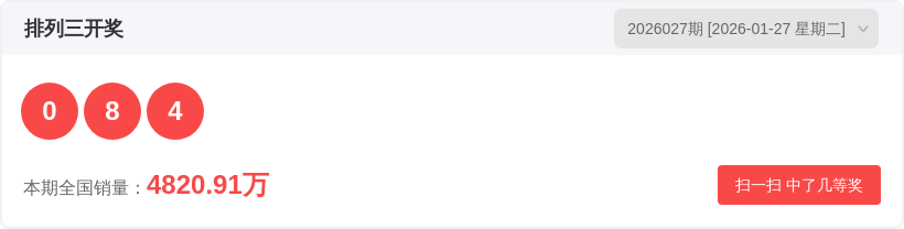 排列326027期开奖结果0 8 4,跨度8,和值12,和值尾2,质合比0:3。