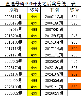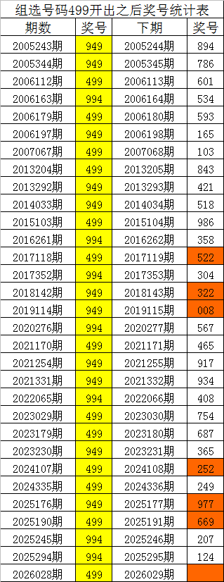 从上表统计可以看出,直选号码499开出之后,其下期奖号: