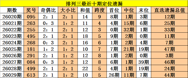 开奖回顾:排列三第2026029期奖号:613,定位直选遗漏值26期、11期、7期,遗漏总值为44期。