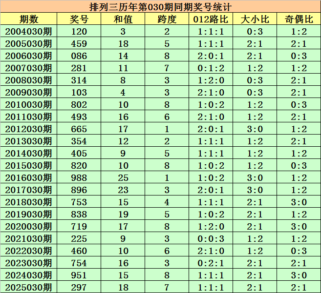 历史上第2026030期排列三已开出22期奖号了,历年同期奖号分别为:120、459、086、281、314、103、802、493、665、354、405、820、988、896、753、838、719、225、460、754、951、297,详细统计见下表: