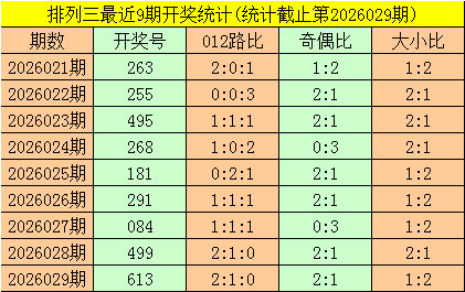 二、体彩排列三前9期奖号开出:263-255-495-268-181-291-084-499-613,其中奖号大小比为13:14,012路比为10:7:10,奇偶比为13:14;