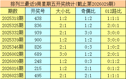 三、体彩排列三前9周星期五奖号分别开出:438-836-939-900-826-689-248-215-495,其中号码012路比为13:4:10,奇偶比为11:16,大小比为15:12;