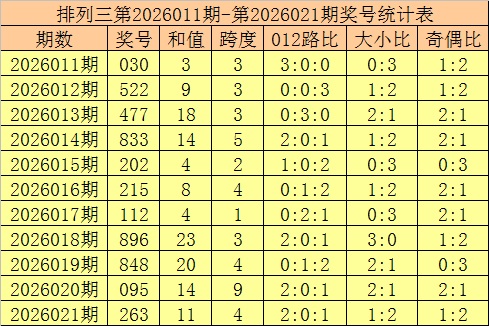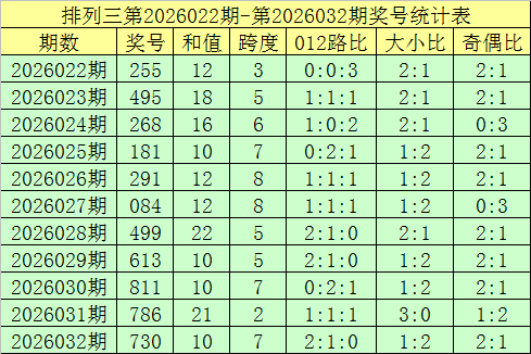 开奖回顾:排列三第2026032期奖号开出:730,组选类型:组六,大小比为1:2,奇偶比为2:1,和值为10,跨度为7。