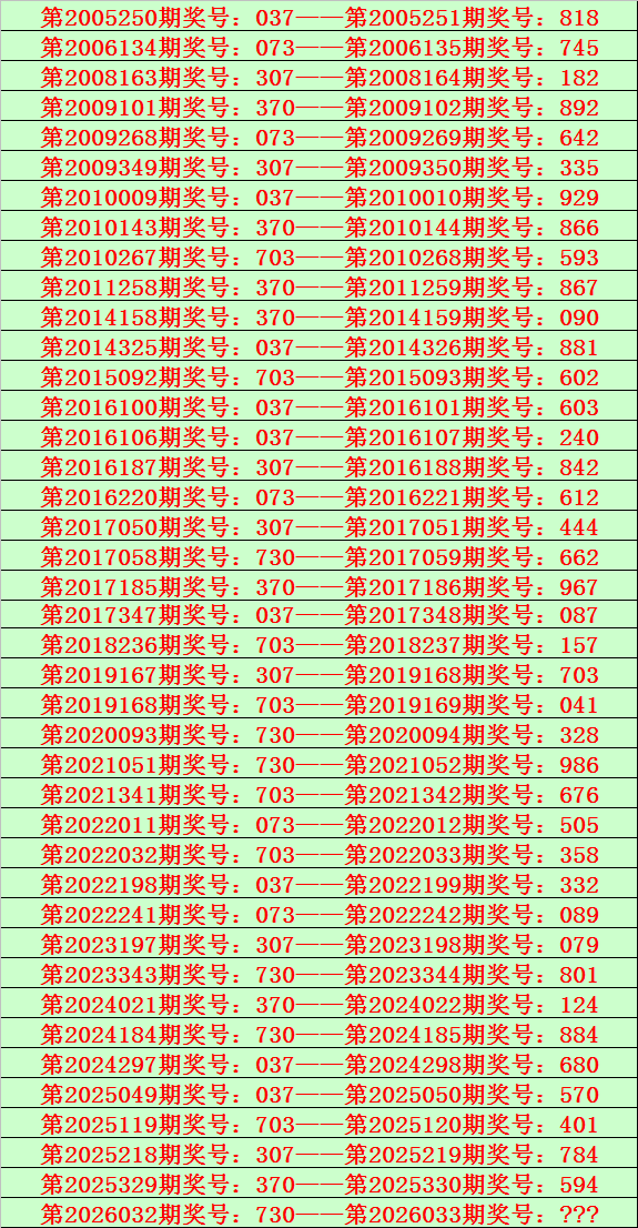 排列三第2026033期开奖日期:2026年2月2日,历史上第033期已开出了22次奖号,历年同期号码分别为:505、590、549、875、520、472、668、062、127、325、949、986、002、785、870、342、767、452、358、679、739、934。