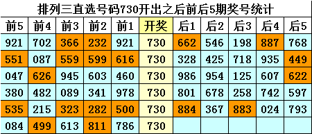 四、排列三直选号码730历史上开出6次,其前后五期奖号分别为:
