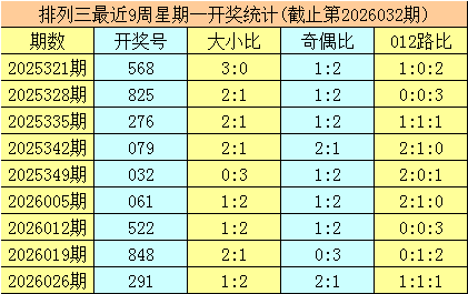 三、体彩排列三前9周星期一奖号分别开出:568-825-276-079-032-061-522-848-291,其中号码012路比为9:5:13,奇偶比为10:17,大小比为14:13;