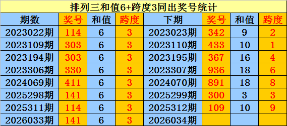 上期回顾:排列三第2026033期奖号:141。和值6,跨度3。