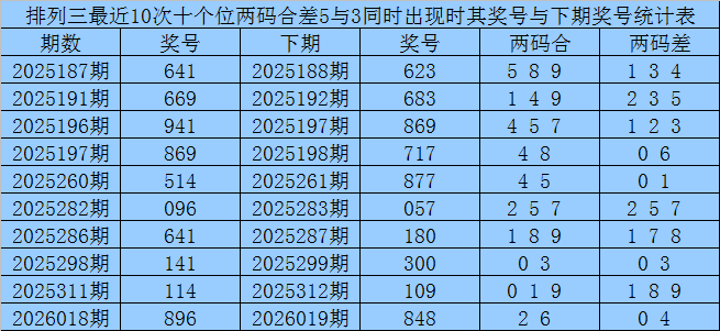 排列三第2026034期奖号两码合差分析: