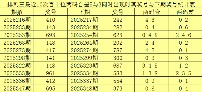 从以上统计可以看出,十个位两码合差5与3同时出现之后其下期两码合差表现最热的4个分别为:1345,本期十个位两码合差可以参考这四码中的数据。