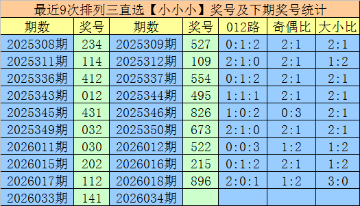1.排列三第2026033期奖号开出141,大小直选分布为:小小小,在历史开奖中直选【小小小】分布已开出953期,在前9次直选【小小小】分布中,出现奖号为:234-114-412-012-431-032-030-202-112,组三开出4期,组六开出5期。