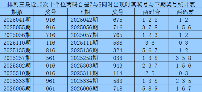 从以上统计可以看出,十个位两码合差7与5同时出现之后其下期两码合差表现最热的4个分别为:1235,本期十个位两码合差可以参考这四码中的数据。