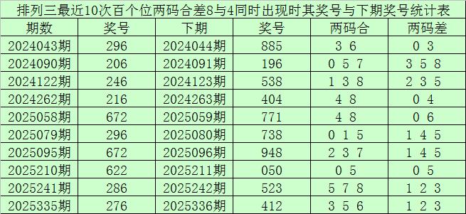 百个位合差分析:上期奖号百个位开出26组合,两码合为8,两码差为4,最近10次百个位两码合8与两码差4同时出现时,其奖号和下期奖号分别为: