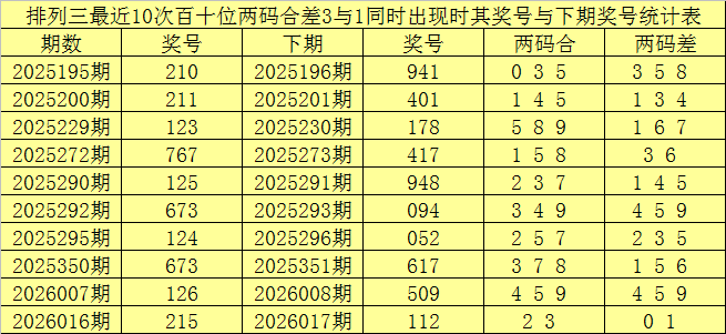 从以上统计可以看出,百十位两码合差3与1同时出现之后其下期两码合差表现最热的4个分别为:1345,本期百十位两码合差可以参考这四码中的数据。