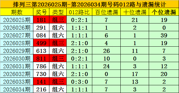 开奖回顾:排列三第2026034期奖号为:216,类型为组六,号码012路比为1:1:1,百十个位号码直选分别遗漏7期、3期和2期。