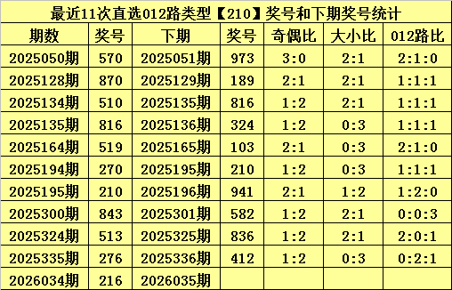 排列三上期开出奖号为:216,其直选012路类型为210,历史上直选210号码已开出了253次,最近11期分别开出奖号为:570、870、510、816、519、270、210、843、513、276、216。