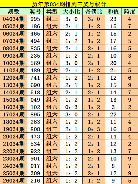 排列三第2026034期奖号:216,和值9,跨度5,大小比1:2,奇偶比1:2。