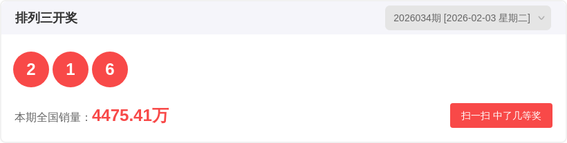 排列326034期开奖结果2 1 6,豹子/组三/组六为组六,和值9,质合比2:1,大小比1:2。
