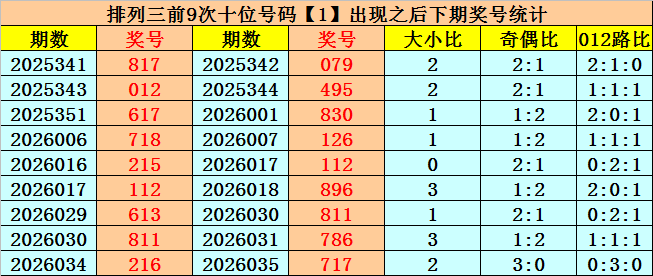 在十位前9次出现号码1后,其下期奖号分别开出:7-9-3-2-1-9-1-8-1,其中奖号个数奇偶比是7:2,大小比是4:5,012路比是3:4:2。