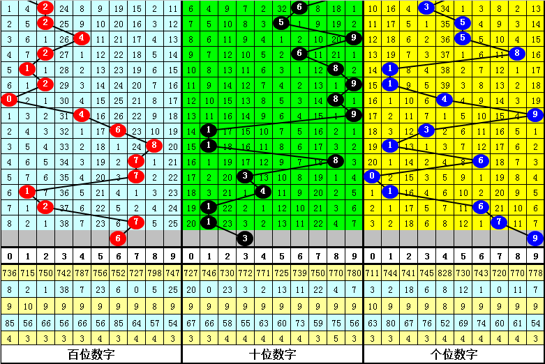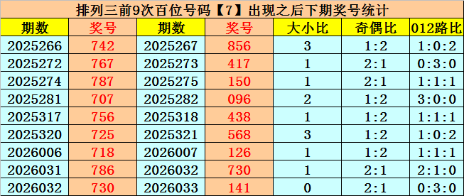 在百位前9次出现号码7之后,下期百位分别开出奖号:8-4-1-0-4-5-1-7-1,其中开出号码个数奇偶比是5:4,大小比是3:6,012路比是1:6:2。