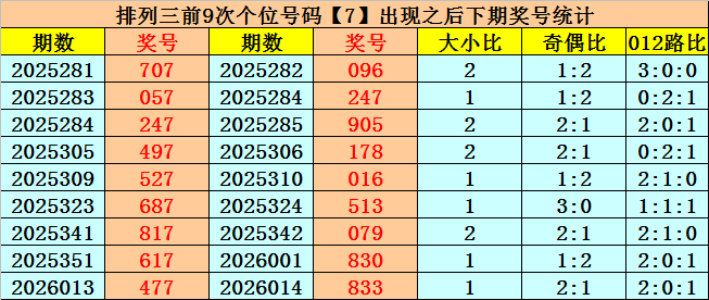 个位号码:上期奖号为大号、奇数、1路号码:7,历史上个位号码7共开出720期,前一次出现在第2026013期,上期遗漏21期再出。