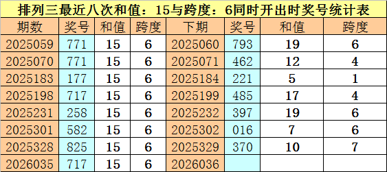 开奖回顾:体彩排列三第2026035期奖号为:717。和值为:15,跨度为:6。