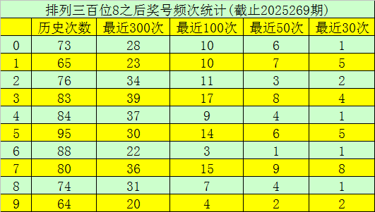 第一位杀号:上期第一位奖号为8,第一位奖号8历史上出现783次,前100次该位开出奖号8之后,下期号码0-9出现次数从高到底分别为:号码3→17次,7→15次,5→14次,2→11次,0、1→10次,4→9次,8→7次,9→4次,6→3次。
