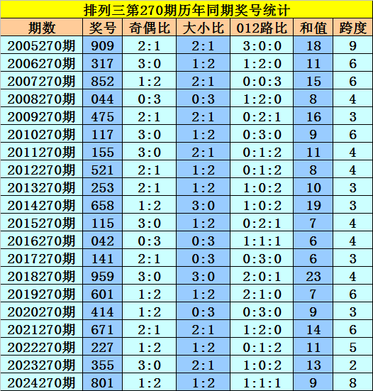 开奖回顾:排列三第2025269期开出奖号875,奖号012路比为0:1:2,大小比为3:0,奇偶比为2:1,最近三年第270期同期开出奖号为:第2022270期:227、第2023270期:355、第2024270期:801。